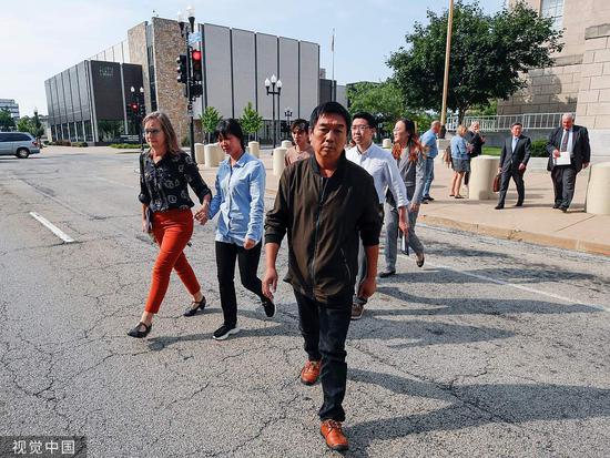 当地时间7月8日,章莹颖的家人走出美国伊利诺伊州皮奥里亚法庭。图/视觉中国