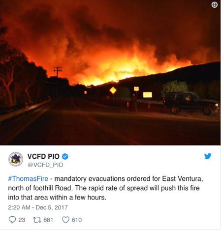根据初始灾情报告,当时“托马斯大火“的燃烧面积约50英亩(约合0.2平方千米)。然而,火势在短短三小时内迅速蔓延,燃烧面积扩大二百倍!同时,名为“麦火“(Rye Fire)的山火也开始肆虐,导致加州多地发布“红旗警告”(red flag warning)。