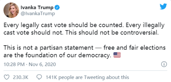“每一张合法投出的选票都应该被计算在内。每一张非法投出的票都不应该被计算。这不应该有争议。这不是一个党派的声明——自由和公平的选举是我们民主的基础。”