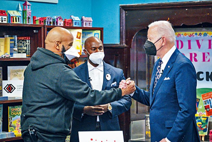 英國《每日郵報》報道,拜登在Jacob Blackwell學校的社區能力發展中心與當地領袖會面,以了解社區暴力干預計劃。當總統跟打擊暴力訓練專家布萊恩特(Shyism Bryant)見面時,跟他來了一個具街頭味道的「Dap」花式握手,並把對方拉近身邊半抱了一下。
