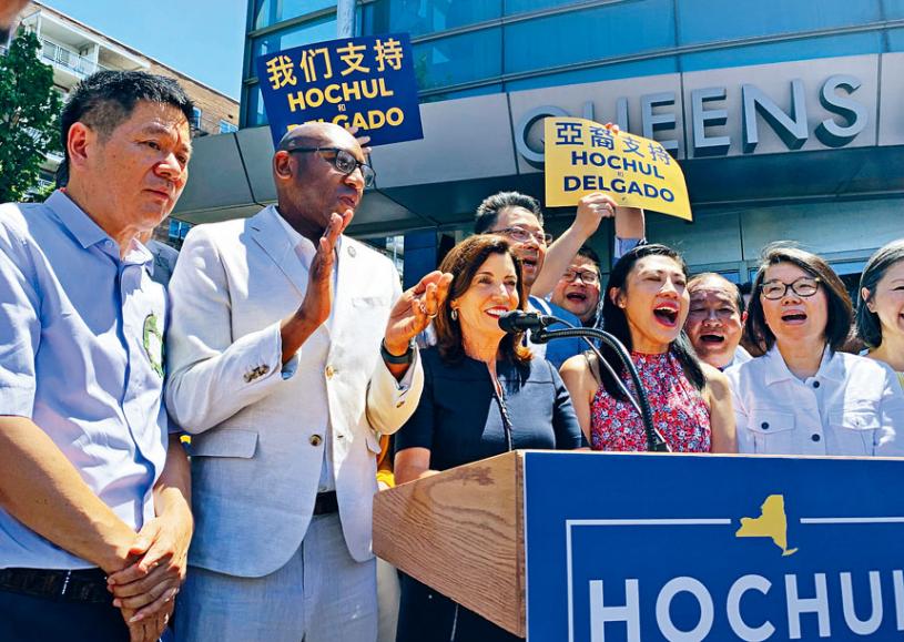 競選連任的紐約州長胡楚(Kathy Hochul)與競選副州長的搭檔德爾加多(Antonio Delgado)在6月28日投票日的周末展開最後衝刺,助選團在亞裔為主的法拉盛舉行造勢大會,法拉盛選區市議員黃敏儀,皇后區長理查茲,競選皇后區民事法官的林凱倫與逾百來自曼哈頓、皇后區、布碌崙及長島的華人社團代表,高舉支持胡楚競選紙牌,高呼「胡楚當選,再來四年」口號。