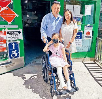 金兌錫在投票日上午與妻子及腿部受傷坐輪椅的女兒到布蘭德政府樓社區中心投票站投票。
