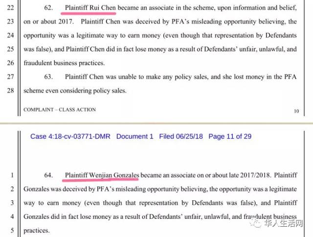 起诉书中原告指控被告PFA典型的金字塔骗,局起诉书中称,这是一个金字塔骗局计划,原告Rui Chen和Wenjian Gonzales基于PFA极具诱惑性的招募信息以及希望获得财务自由的信念,在2017年至2018年期间加入PFA。