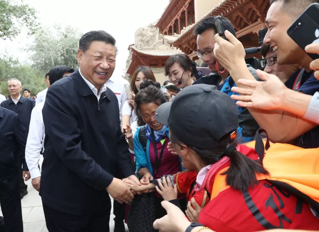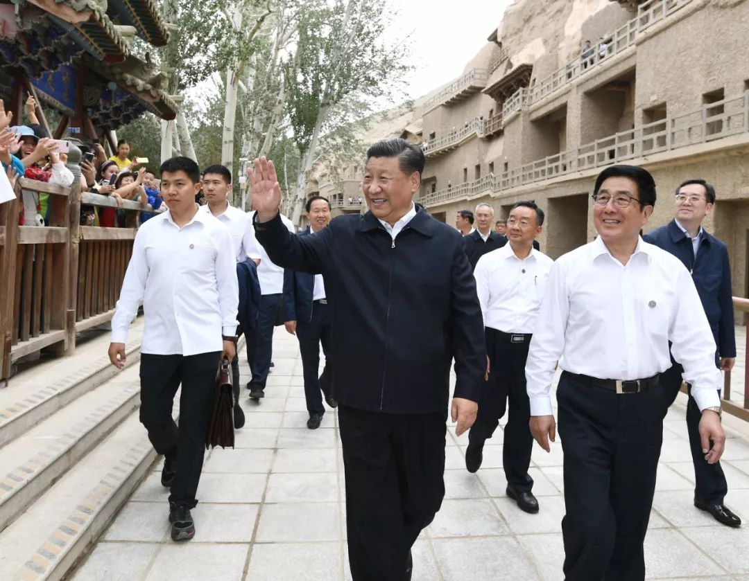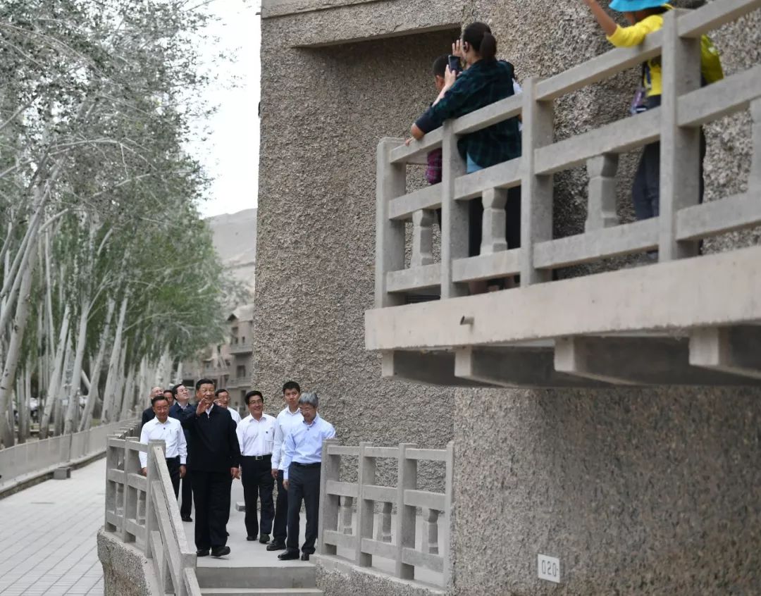 习近平在敦煌莫高窟考察调研时,向正在参观的游客亲切招手致意。