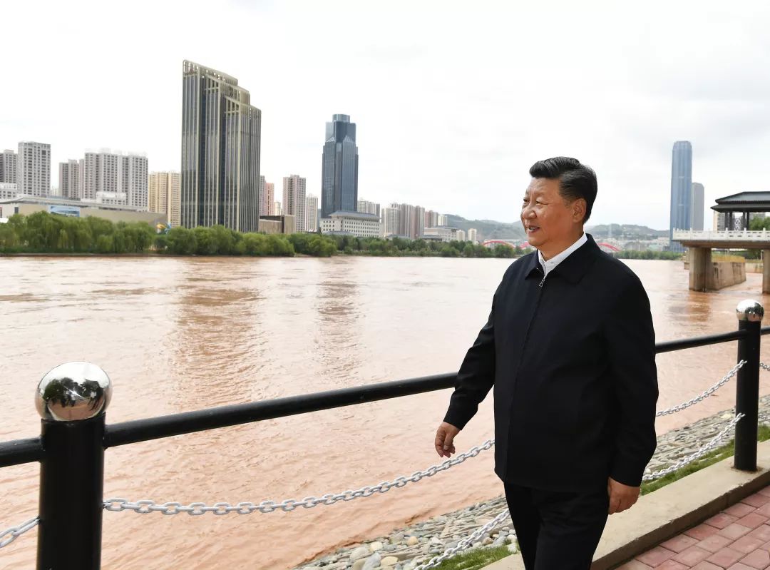 习近平在兰州市黄河治理兰铁泵站项目点,沿步道察看黄河两岸生态修复和景观建设情况。