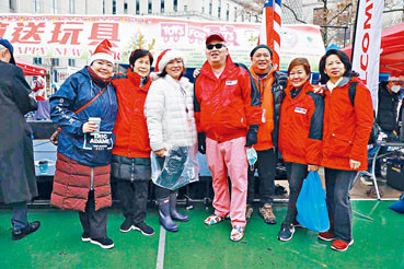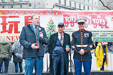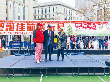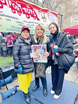 名電視記者Rita Cosby(右)高度讚揚Joseph Cinque及梅建國成功舉辦佳節送玩具活動。