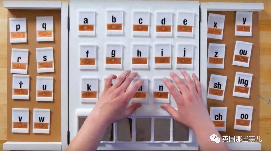 盲童通过用手触摸刻着盲文的小块儿,小块能自动发出这个文字的声音。