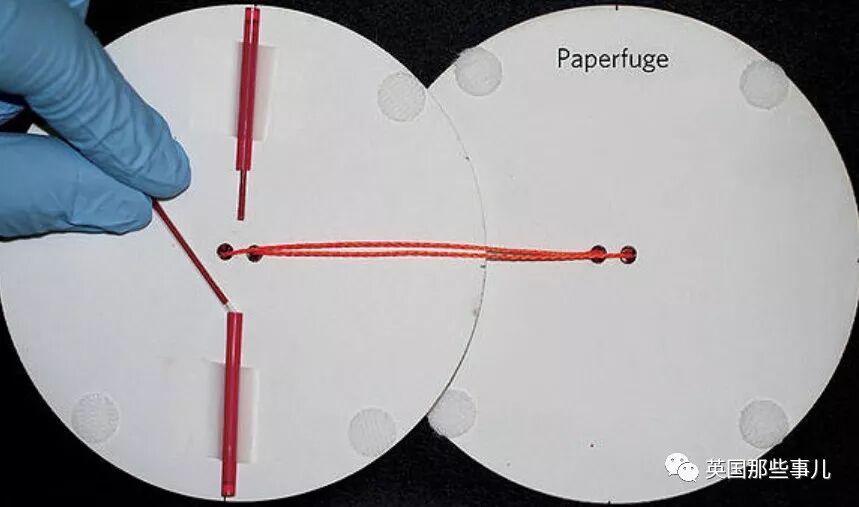 在纸陀螺的纸盘上,装着很细的试管,里面是检测者的血液。
