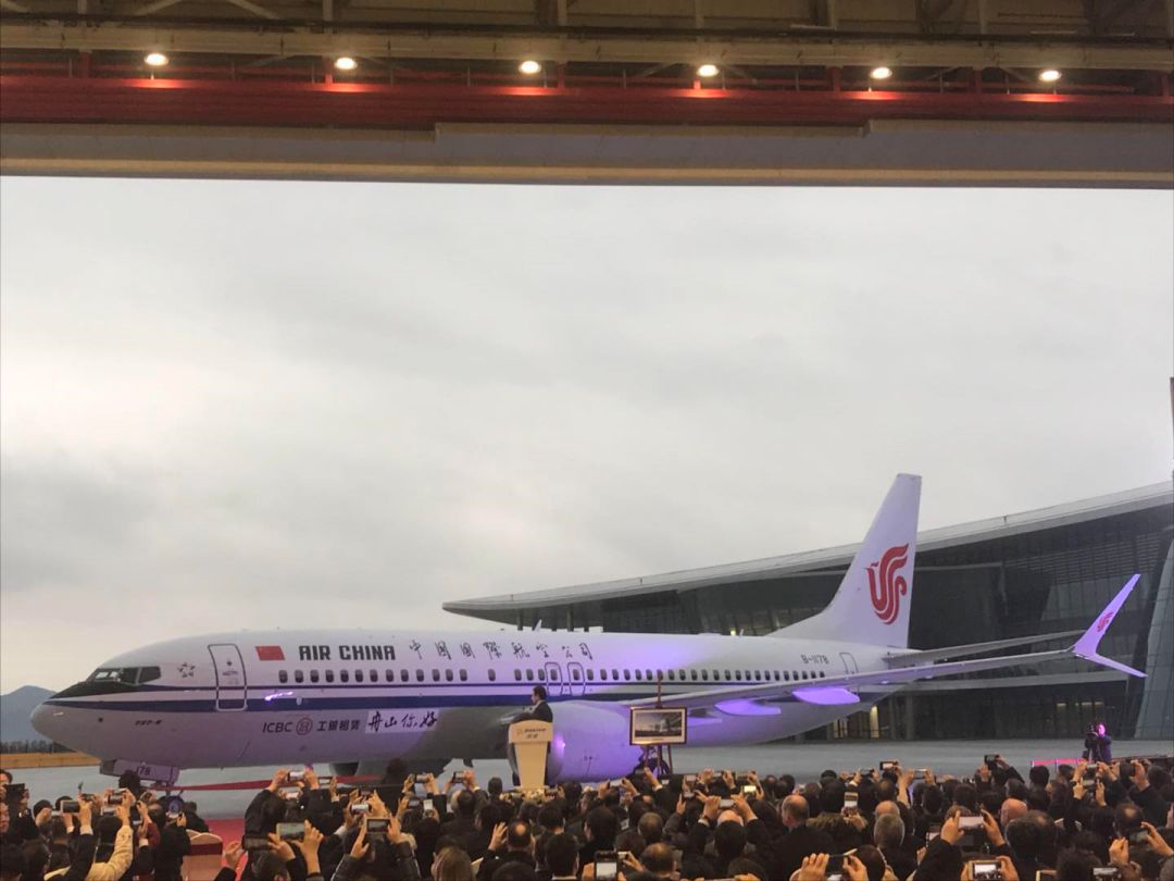 11月19日,一架波音737MAX飞机从西雅图飞抵舟山普陀机场,此后的20余天时间里这架飞机在该中心厂房进行最后的内饰施工。此次交付也标志着波音舟山737完工和交付中心项目正式投入运营。当天波音民用飞机集团总裁兼首席执行官凯文·迈卡利斯特在致辞中表示,这是波音和中国长达40年合作的最新篇章。