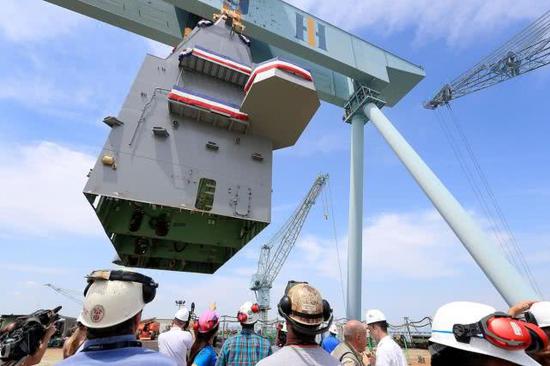 据报道,“约翰·肯尼迪”号的舰岛重达588吨,未来将作为飞行甲板作业的指挥和控制中心。舰岛同时也是最后一批可以被放置在船上并被称为超级升降单元的钢结构之一,它的吊装到位标志着“约翰·肯尼迪”号九成以上的结构建造已经完成,同时意味着“约翰·肯尼迪”号距离下水更近一步。
