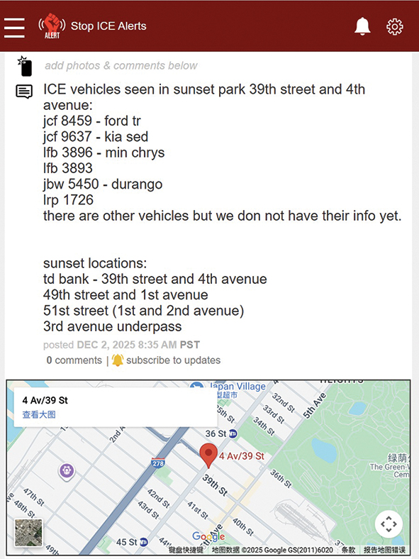 现场围观者很快发出警告,指当地执法部门疑似正与ICE在日落公园合作执法,表示国土安全部的这辆厢车此前曾出现在ICE突袭行动中。社区民众随即将消息广为传播,并通知了当地民选官员。