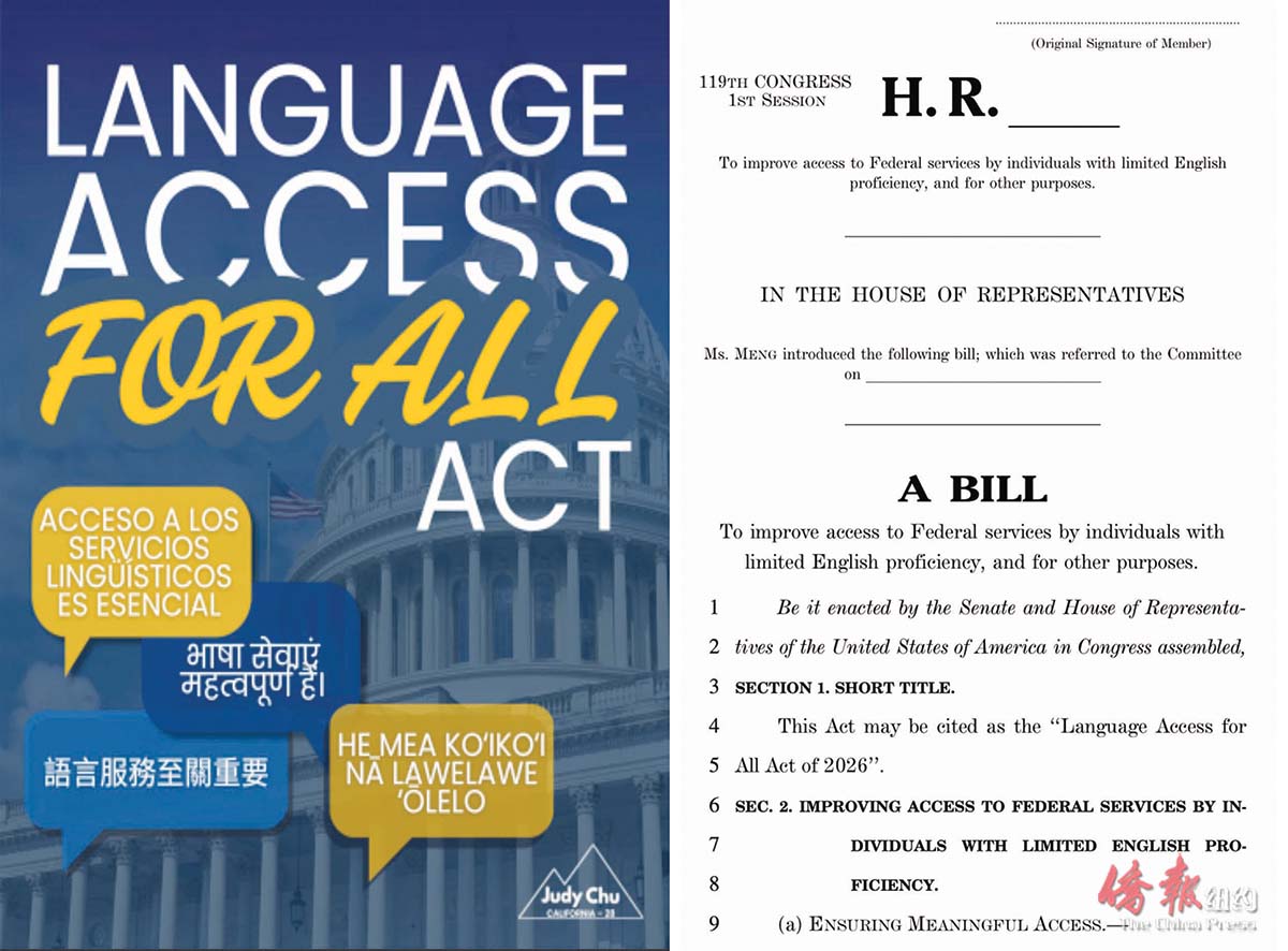由众多国会亚太裔小组成员共同提出的“2026年全民语言可及法案”(Language Access for All Act of 2026),旨在将联邦机构的翻译和口译等语言服务要求正式立法予以保障,以应对联邦政府对裁剪这些服务的威胁。