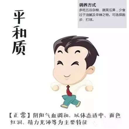 不胖不瘦、面色红润有光泽,精神好、对冷热都很耐受,睡眠好,胃口好。舌头淡红色,舌苔白而薄。不爱生病、性格也比较开朗随和。