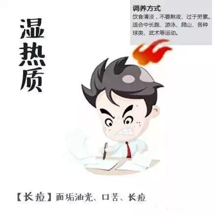面垢油光、易生痤疮粉刺。身重困倦,大便黏滞不爽,小便短黄,男性易阴囊潮湿,女性易带下增多。对于气温偏高、湿热的气候难以适应。